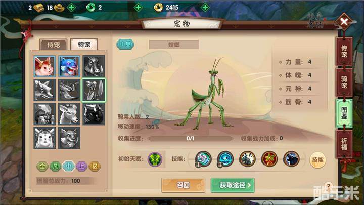 另外在野外还可以获得的骑宠就属螳螂和搬山蟹了,螳螂和搬山蟹的主要获取途径就是在野外击败怪物之后有几率掉落其对应的星魄,而当收集足够66个该骑宠的星魄后就可以在合成系统中合成该骑宠。螳螂的星魄获取主要是需要在喇叭口地区的河神庙附近击败虫系的怪物。这里不仅可以刷骑宠星魄还可以刷很多的素材道具,所以一般来说这里会有很多仙友在此处挂机刷怪,组上六个人在这里挂机,基本上一晚上时间就能够将骑宠刷出来了。不过骑宠螳螂的主要匹配职业还是金刚力士,因为螳螂自带的技能偏向物理攻击,而且其主动技能是嘲讽,会让周围的怪物都攻击自己,所以还是推荐金刚力士使用比较好。