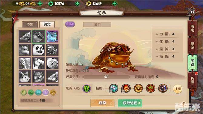 一样望去遍地蛤蟆,这就是寻仙手游现阶段上品骑宠中泛用性最广的骑宠了,没错,它就是金甲。金甲以主动技能可以造成控制及位移,而且获取方式是在镇妖塔中用一万五千点声望兑换所得以及在真法蛋中获取,所以基本上后期人手一只,许多声望值富裕的仙友还会拿它去喂喂图鉴,由于获取难度低,所以一到团队活动或者是团队战斗的时候,放眼望去,天上地下全是蛤蟆,十分壮观。