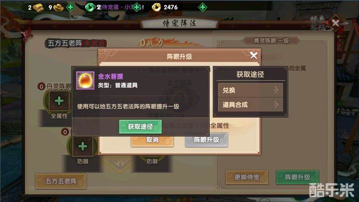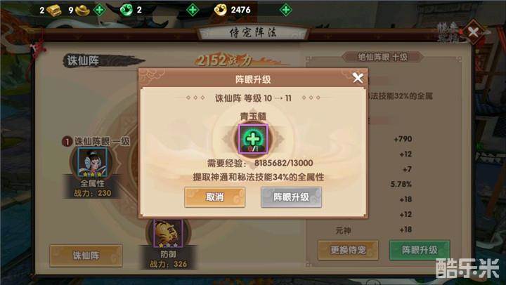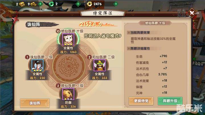 阵眼等级提升需要消耗一定的经验值以及道具金水菩提,金水菩提可以在兑换系统中的镇妖塔商店使用500声望兑换,每次刷新限换10个,阵眼等级提升后可以提升提取技能效果属性的百分比,以诛仙阵为例在阵眼10级的时候可以提取当前宠物32%的属性。