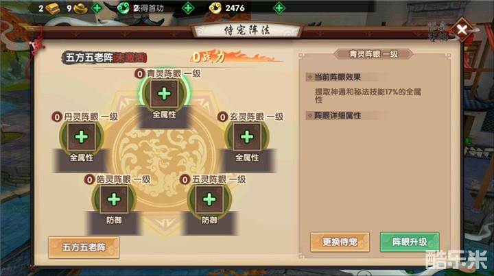 五灵阵眼:防御属性阵眼,基础等级时提取神通和秘法技能的17%的防御属性(不包含四维属性)