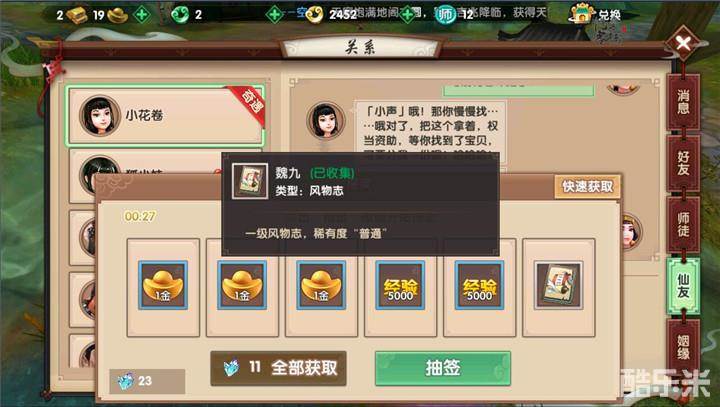 当然除了大荒兵录风物志这种奖励以外,这里还分为绿色、蓝色、紫色、橙色四种宝箱,绿色宝箱中会获得少量金钱、少量经验、天赋经验丹以及低级风物志,蓝色宝箱除了经验和金钱比绿色稍微多一些以外并没有什么区别,紫色也是一样,只是增加了经验值和金钱的获取量。而橙色的则会随机出现大荒兵录风物志,不过橙色出现的几率极低,橙色宝箱中抽到大荒兵录风物志的几率也很低,另外,从宝箱中抽到大荒兵录风物志的几率,也是非常低的。