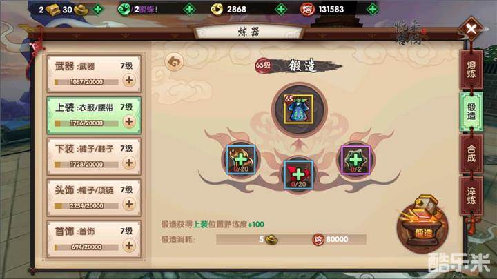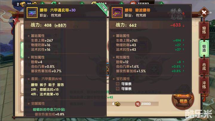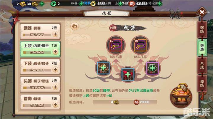 金色装备:金色装备通常来说都是副本套装,是仙友们的优先选择,该装备需要仙友到达一定等级后刷对应等级的副本,然后打出副本特有的星石与素材之后在锻造系统中锻造得出。副本金色套装的属性比较好,而且出的觉醒效果大多也都比较好,属性偏向战斗属性,非常适合战斗。只是成功率比较低,拿62级最高等级的副本金装来看,基础成功率只有20%,这可以说是相当低了。另外副本装备还讲究四件成套,成套之后会附加大量属性和战力,所以说,带两套不同级别的副本套装也是常有的事情。另外65级的塔装也是金色装备,属性和战力也都不错。
