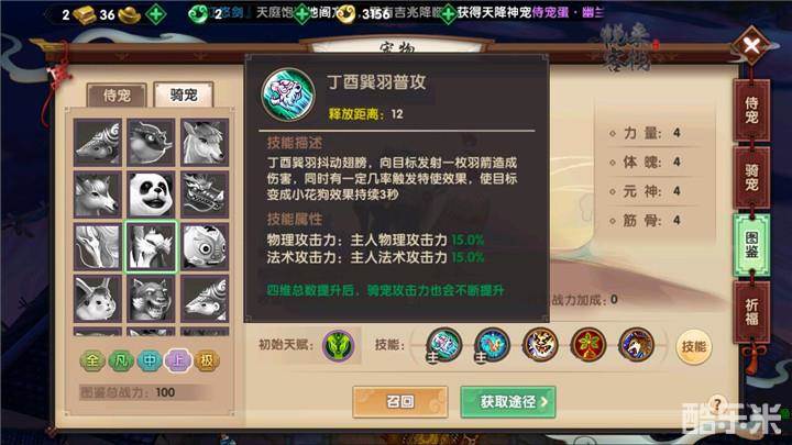 由于我是一只上品骑宠,所以我可以拥有五个神通技能,只需要在前三个技能池中抽取即可,我比较推荐选择会心方面以及主人自身属性相关的技能,因为我是一只通用型骑宠,无论是谁都可以骑乘,技能和总体的效果也是因人而异,所以可以放心使用。但骑上来的时候不要碰我肩膀,你可以坐在我为你准备的坐垫上,或者抱紧我胸前的高级宠物玩具。