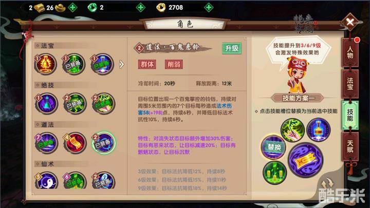 幽冥符咒师比较重要的技能则是技能连接,主要在于仙术技能恶来和仙术技能魍魉这两个技能的特殊效果,以及对流失状态附加的额外伤害,恶来效果大多可以通过其他技能的二次伤害对敌方造成减速的控制效果,而技能魍魉状态则可以通过二次技能伤害来造成沉默效果。要知道沉默效果在PVP里可是最强的控制效果,战场瞬息万变一个技能可能就可以决定胜负,而无法放技能只能依赖普攻的仙友,一旦慌乱,很容易被人集火杀死的。另外两仪符之类的技能也可以在关键时刻切换成回复状态为仙友加血。