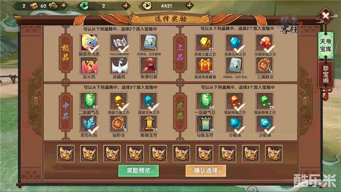 本次宝库中的奖励分为四个部分,极品中拥有骑宠布布虎,七十级红色腰带,风物志,浴火凤,冰晶凤以及限定秋季时装,可以从中选择两个放入奖池。上品分区有完美力量、元神之石*27,无暇体魄之石*9,极品侍宠星魄*15,风物志和三清敕令,可以从中选择两个放入宝箱。中品里面则是由大量灵石礼包以及大量残缺宝石,凡品里自然是少阴珠和少阳珠的奖励比较亮眼。由于每次的宝箱都有一个免费抽取的机会,所以抽中少阴珠和少阳珠的几率还是很高的。