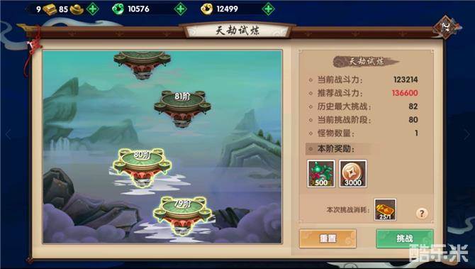 天劫试炼第八十层推荐战力136600,怪物数量一只,本层奖励包含了天赋经验以及残缺宝石等等,挑战需要消耗道具破劫令一个,失败后再次挑战则不需要消耗,直到从本层胜出。重置后挑战也会获得少量天赋经验以及金钱奖励。