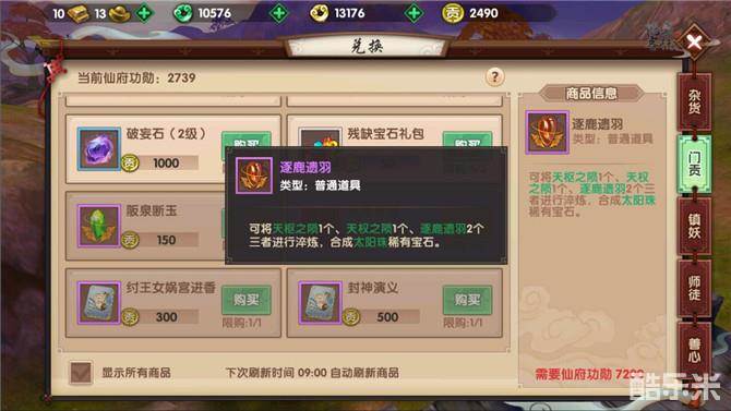 残缺宝石礼包:售价50门贡,每日限购5个,解锁需求仙府功勋2400
