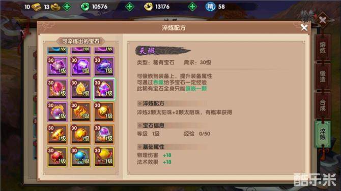 天璇(紫):淬炼2颗太阳珠+2颗太阴珠,有概率获得,基础属性物理伤害、法术效果+18