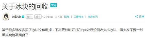 活动过后,如果有剩余的道具怎么办?要是通过战斗或剧情获得的也就罢了,要是花钱买来的呢?当时出手的可都是真金白银呀…不用怕!《暴走英雄坛》在官方论坛公布消息,活动期间剩余的付费道具“大冰块”和“小冰块”可以在NPC处原价回收!讲道理,玩了这么多年游戏,只见过向玩家要钱的,从没见过主动还给玩家钱的…你们真的不赚钱了吗?这种“反氪金”机制要不要这么奇葩??