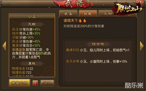 小玉的觉醒技能为“采魂滋身”:在敌军阵亡后,令自身回复计策攻击80%的兵力,并回复1点怒气。觉醒后的小玉将变成一个回复型武将,只要敌人减员就能回复大量兵力以及1点怒气,2怒的技能将随时叠满。强大的回复能力,对于打野城或者那些旨在消耗你兵力的敌城都是克星。