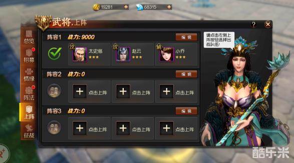 武将界面有招募、情缘、阵法、上阵、征战等操作。并且可以点选对应武将查看其技能,武将技能一般需要升星解锁,所以小伙伴们需要不断搜集武将碎片,培养更加强力的武将。