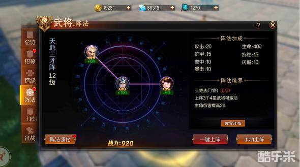 武将阵法可以进行多级强化, 更高级的阵法可以激活更多的空位。上阵武将,排成对应的阵型增加战力!
