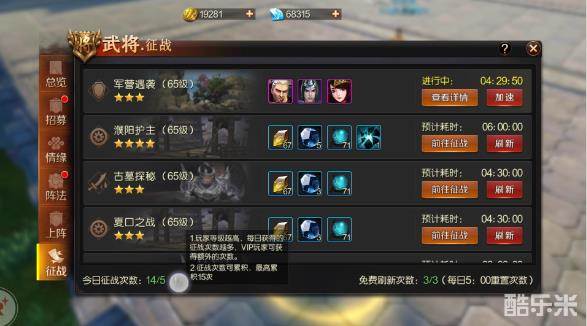 而武将并非只有战斗时才有收益,在空闲之余玩家可以派武将外出征战获取培养材料。每次派遣持续4:30。玩家等级越高,每日获得的征战次数越多,VIP玩家可获得额外的次数。征战次数也可以积累,最高积累15次。大家可以趁闲暇之余一次性完成哦!