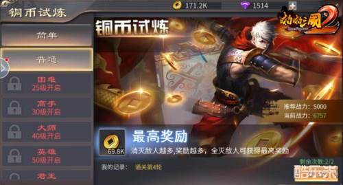 活动中的“铜币试炼”,可让主公们大量获得铜币。铜币试炼可每日参与2次,试炼共有7个难度,主公们只有消灭的敌人越多,获得的奖励也会更多,全部消灭本难度将获得最高奖励。每层难度都有推荐战力,主公们要量力而行哦。