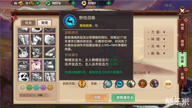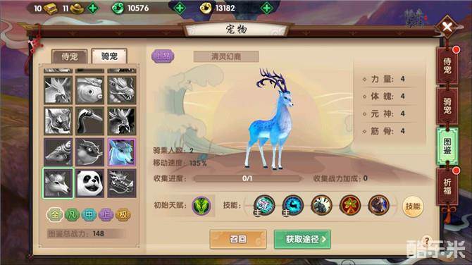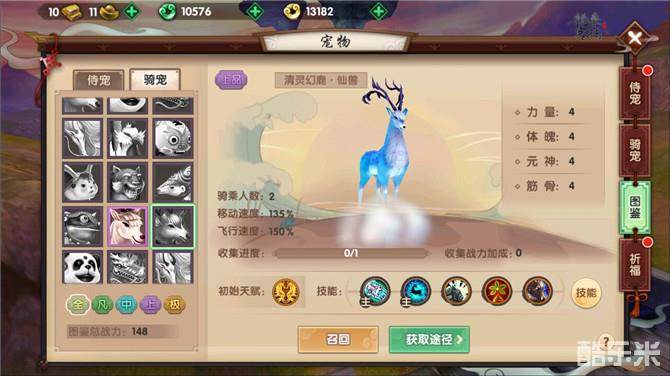 虽说如此但是清灵幻鹿的总体属性还是稍稍偏向物理系的,因为在它的秘法技能当中有一个可以忽略物防的碎甲诀在,只要四维全部达到7即可解锁。不过这也不是必点的技能,毕竟技能点还是非常有限的,所以只是会有一点点的优势,而不会影响骑宠的实用。