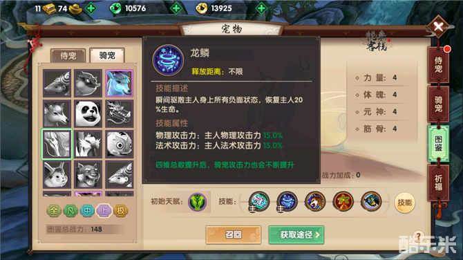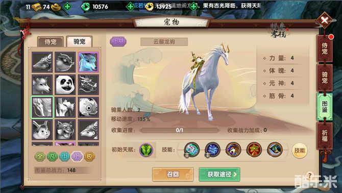 云鬃龙驹是一只上品骑宠,所以它的四维基础全部都是4点,也就是共计16点的全部属性,这也让它可以直接开启主动技能,而当全部属性总和达到32点的时候,云鬃龙驹就可以将主动技能提升至最强的状态。