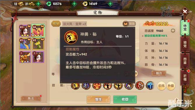 它们适合战斗的原因一个是因为他们的秘法技能都基本上是非常强大的属性加成,但其实还有另一个原因,那就是他们携带的变异天赋属性都是极为强大的,尤其是哪吒、禄星、浴火凤这三只侍宠,他们携带的“神勇秘”的变异天赋,最高可以让主人提升10%的法效和攻击力,是提升BUFF中最强的存在,所以可以说是战斗必备。而且现阶段哪吒和禄星还可以通过须弥纳宝盒积分来兑换星魄获取。