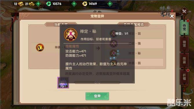 适合医疗的侍宠:禄星、浴火凤。适合医疗的侍宠一定是法术系的侍宠,而且由于浴火凤和禄星拥有相同的两个变异天赋技能,一个是刚刚提到的神勇,另一个则是医疗秘术“禅定”了。禅定技能可以让主人的治疗效果大幅提升,也是一个非常强大的技能。而且也因为这样,他们两个也是适用性比较强的侍宠。