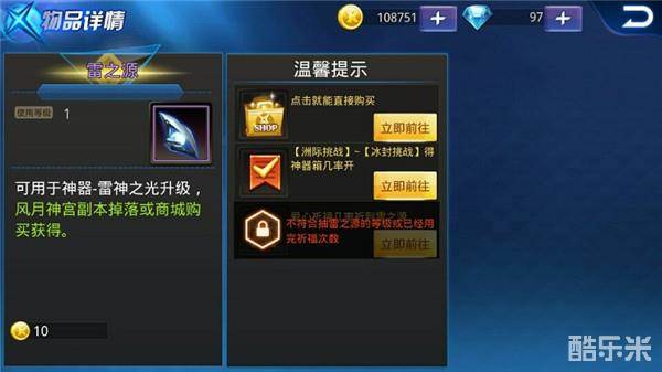 雷之源的获取途径之一就是直接点击用钻石购买,50钻50个、100钻105个、200钻220个、500钻590个,买的越多优惠也就越多,可以根据自身条件选择。