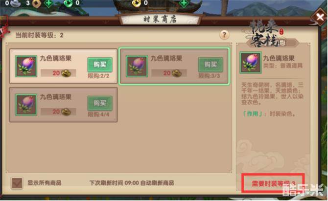 解锁染色需要消耗道具「九色璃珞果」,而时装商店目前也只售卖三个道具,都是染色道具「九色璃珞果」,但是需要时装等级限制,等级越高能购买到的道具也就越多,等级到达2级,每天限购2个,到达3级,每天限购3个,到达4级,每天限购4个;每天早上9点刷新购买限量,不可手动刷新,不可越级购买。「九色璃珞果」每个的售价是20金,而每次解锁颜色需要消耗10个「九色璃珞果」,也就是说每天我们最多可以购买到9个道具。虽然这些不够解锁染色,但不用担心,因为在普通副本的每日高倍奖励中,也是有机会获得「九色璃珞果」的哟。