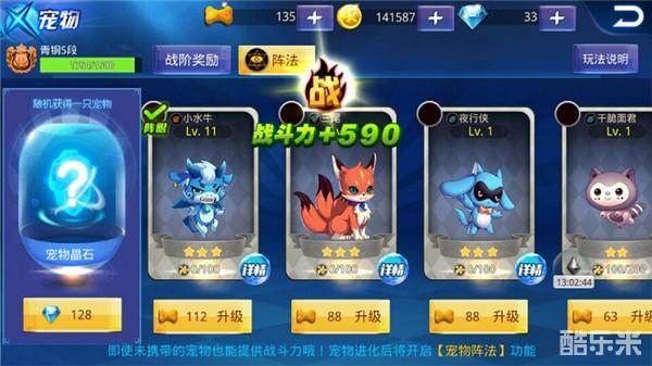 点击变强里的宠物图标就会弹出宠物界面,在宠物界面,我们不仅可以查看自己所拥有的宠物,也可以花费128钻随机获取一种新的宠物。