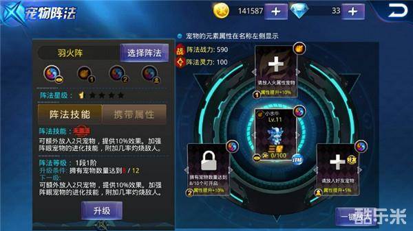 宠物不仅可以配合角色还可以习得阵法,阵法的开启条件是需要一只进化的宠物,不同宠物的阵法效果是不一样的,阵法也可进行升级,等级越高效果也就越好。重要的怎么让效果搭配主角发挥出最大的优势。阵法技能的升级是需要宠物数量达标的,携带属性就是宠物所带来的。在阵法中一定要把最好的宠物放在阵眼中。