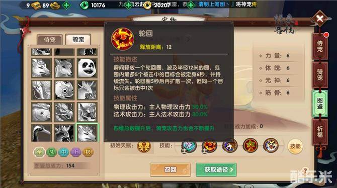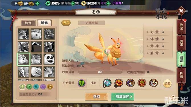作为极品骑宠,六尾火狐的四维全部都保持在6点,上限则是全属性10点,而若是当六尾火狐进化到仙兽之后,在使用龙珠草喂养的话,就可以达到更高的水平了。四维属性除了可以直接提升主人战力之外,还能够用来解锁秘法技能和主动技能。在全属性单个都达到7点的时候,则可以解锁提升会心伤害的技能虚空力、全属性单个都达到9点则可以学习增加生命值的龟虽寿、而在达到10点的时候就可以学习提升伤害减免的腾挪步技能了。