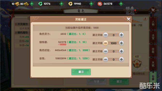 在仙器灌注方面我们可以灌注角色灵力、熔炼值、角色经验以及金钱四种,这四种的兑换比例都不同,在灵能灌注中5点灵力=1点灵能,10点熔炼值=1点灵能,3000点经验值=1点灵能,12银50铜=1点灵能。在这里小仙是非常不赞成以金钱和经验来灌注灵能的,因为若是小仙需要灌注一千点灵能的情况下,就需要花费1砖25金,而这些钱仅仅只足够在玉骨阶段升级一次的,实在是花费太大了。经验值也是同理,在非常需要经验值的现在,用三百万经验值转化为1000点灵能也是非常不划算的。