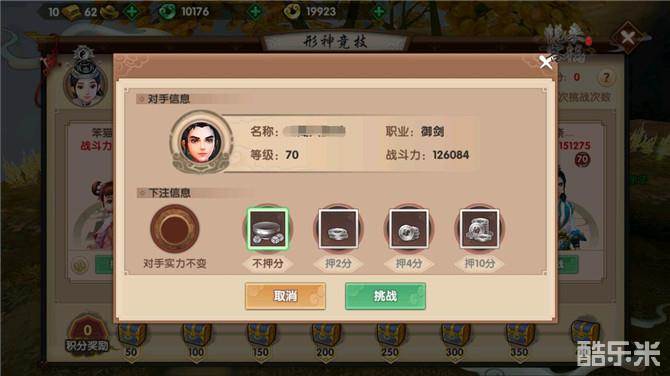 在比赛中点击挑战就会出现下注信息,分别有不押分、押2分、押4分、押10分的选项,这些选项除了会让对手实力大增以外还会增加自身获取积分的量。在前期我们推荐新手仙友可以不用考虑,只管押10分就行了,因为在前期基本就可以无视这点提升,只要注重打法押10分也是完全打得过的。但是在后期战力较高的情况下,押高分的办法基本上就不可取了。
