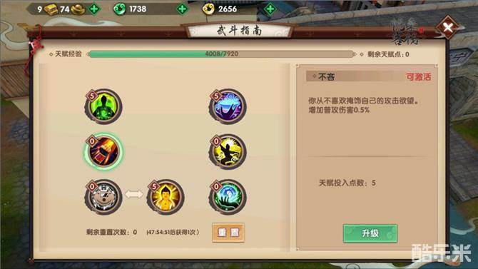 对战类的关键在于提升自身在对战时的特殊效果,所以除了基础属性的提升以外,我们还要额外提高一些对对战有利的属性,而这些技能就在天赋页【风云劫源】和【武斗指南】中哦。