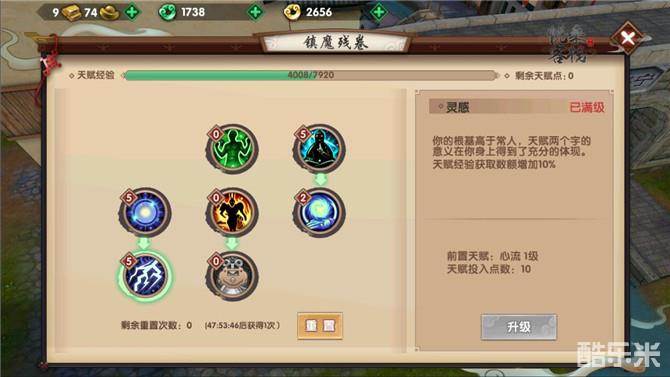 获取经验也是很重要的一个部分,尤其是天赋经验和挂机奖励,这两种经验奖励都可以在天赋技能中使其变得更加容易获取哦,具体的部分就在天赋页【镇魔残卷】中。