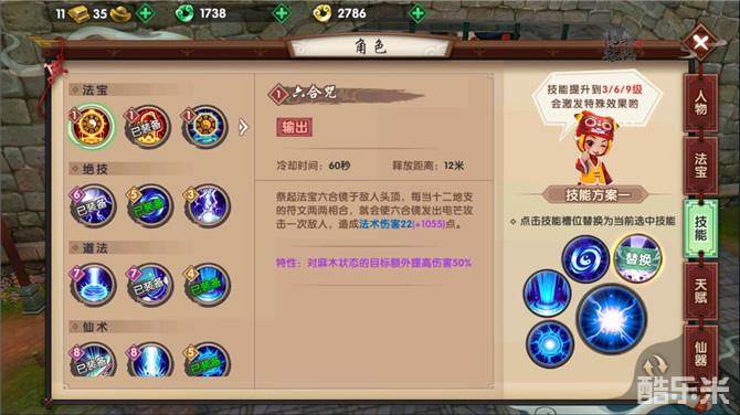 法宝技能六合咒会在敌人头顶召唤出一个六合镜,每过一段时间就会对敌人释放一次雷电攻击,一共造成六次伤害,但伤害值较低,而且是单体攻击,所以作为输出手段较为鸡肋,不推荐优先携带。