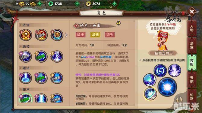 我们先从第一页说起,第一页我们一般选择带一些先手技能,而且这些技能通常我们选一些没有起手硬直,也就是可以在移动中使用的技能比较好。仙术部分推荐选择【曲射】,原因是因为其起手无需硬直与蓄力,而且距离足够远,并且造成异常状态的同时也能造成不俗的伤害,属于顺手就可以释放的技能。道法部分我们推荐【荡雷】,原因和【曲射】一样,可以在移动中使用,造成大量伤害且能够这两个技能搭配普攻可以触发定身以及技能对定身目标的增伤效果,使用方法为【曲射】→【普攻】→【荡雷】。