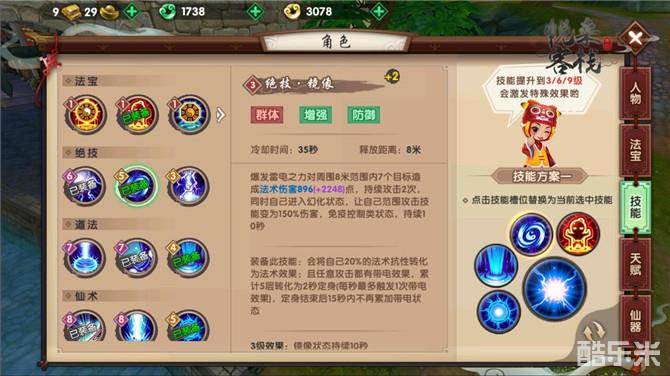 第二页我们首先要讲的是绝技,这里必然是佩戴【镜像】的,其一是因为【镜像】技能可以让我们进入免疫控制并且增强范围攻击伤害50%的效果,而且在装备此技能后,20%的法术抗性就会转化为法术效果,这是无可取代的属性,所以毋庸置疑。在法宝技能方面也是不用商量的【太乙金光咒】该技能可以立刻刷新仙术和道法技能,并且将绝技技能CD减少15秒,极强的刷新技能,不考虑其他。