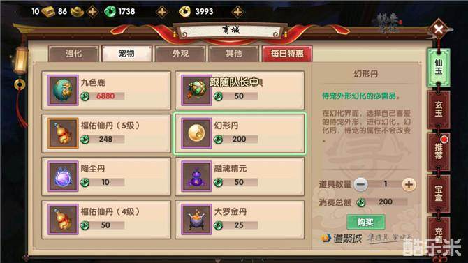 在仙友们达到40级时,就会开放侍宠的幻化功能,我们进入侍宠界面中,侍宠外形右下角的幻化按钮可以点开激活幻化界面,在这里侍宠幻化有两个必要条件。一是我们图鉴中被激活的侍宠,才能够当做幻化用的外形,也就是说,我们如果想要将侍宠幻化为另一种侍宠,就首先必须要拥有它一次才可以。第二个限制,是我们在幻化的时候需要消耗道具【幻形丹】,通常进行幻化的时候,我们需要消耗三颗该道具,这个道具我们可以在仙玉商城中购买,现阶段价格为200仙玉一颗,需要进行幻化的朋友们,直接来此购买即可。