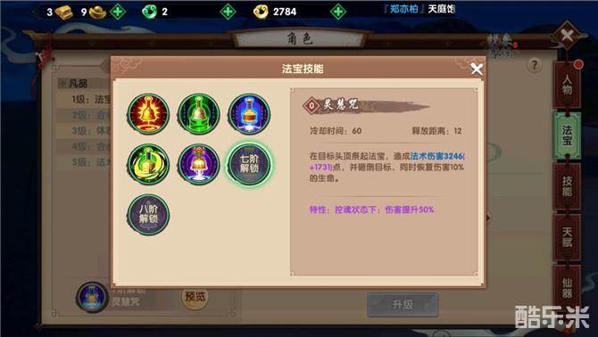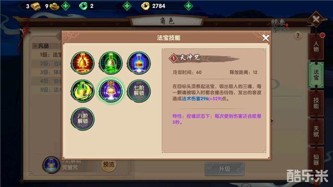 指向性范围法术攻击。在目标头顶祭起法宝,每秒对其周围敌人造成法术伤害,持续十秒,攻击十次。在控魂状态下增加50%伤害。该技能可以说是【爽灵咒】的进化版,但由于效果还是过于一般,所以不推荐携带。