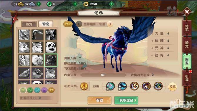 墨蹄绝影,最新的极品骑宠,出自须弥纳宝盒,当然我们也可以通过道具合成系统,使用20个该骑宠的星魄而将这个骑宠合成出来。由于该骑宠是极品骑宠,所以最初固定的四维全部都是6点,而基础最高可以达到10点。在其进化成仙兽之后,则可以通过喂养来进行提升,最高四维可以达到12点。