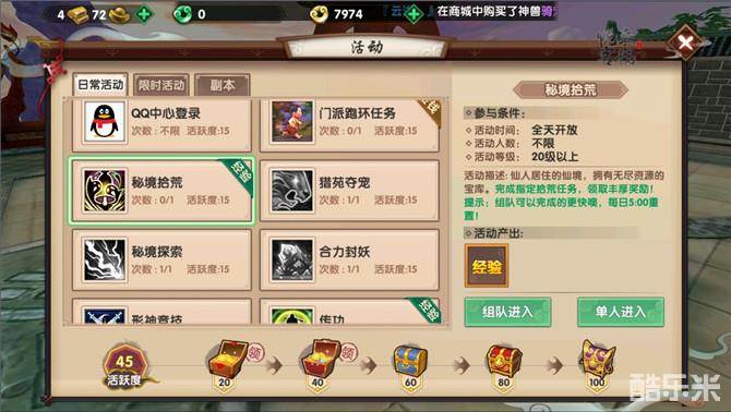 在每日四活动秘境拾荒、合力封妖、秘境探索和猎苑夺宠中,只有秘境拾荒是进入后不消耗次数的,而且它不仅进入后不消耗次数,三个拾荒任务没有做完的时候,也不会消耗次数,我们只有将三个拾荒任务做完,秘境拾荒的次数才会消耗掉。