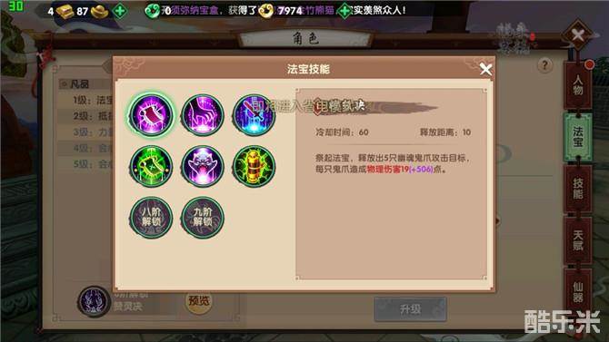 单体指向性攻击。祭起法宝,释放出五只鬼爪攻击目标,造成少量物理伤害。该技能效果一般,属于前期技能,后期几乎没有携带的必要。