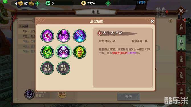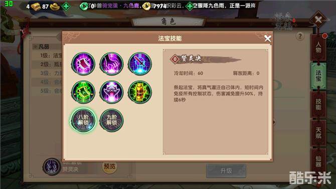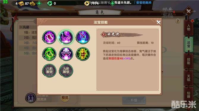 主要伤害技能。身前祭起法宝,法宝汇聚成一道巨大冲击波,造成大量的伤害。该技能是在后期也可以使用的伤害技能,伤害效果极高,非常使用。