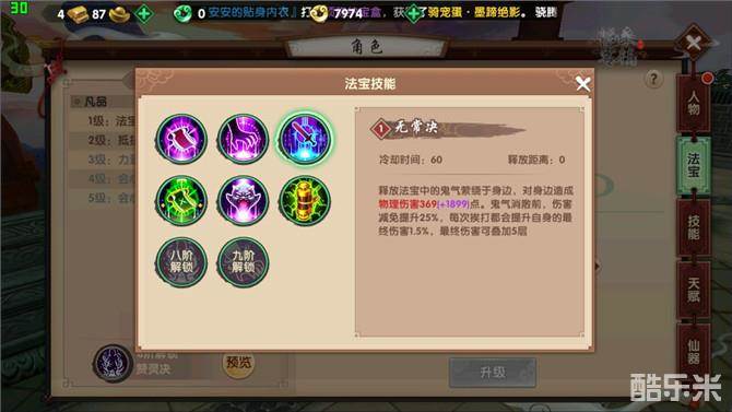 BUFF技能。释放法宝中的鬼气,对身边的敌人造成中量伤害,在技能持续时间内,罗刹力士的伤害减免提升25%,每次挨打都会提升自身最终伤害1.5%,最多叠加五层。该技能是在后期也可以有非常不错效果的法宝技能,适合仙友们携带堆加BUFF。