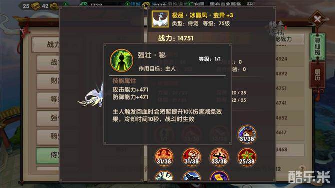 冰晶凤虽说是一个物理输出型的侍宠,但其天赋技能却十分偏向防守,尤其是技能【强壮】,在自身触发回血的时候,便会给自己提升最高10%的伤害减免,这个技能可以说是大大提升了奇门游侠的生存能力,况且奇门游侠本身就带有回复技能,所以该天赋也会发挥出应有的效果。
