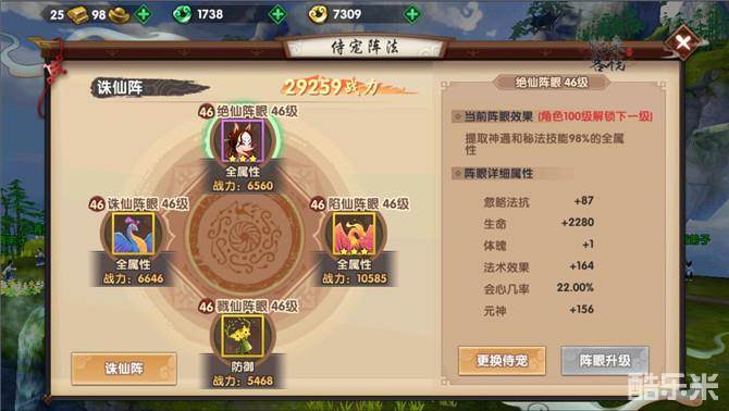 关于侍宠阵法方面,主要推荐的属性便是元神、会心几率、会心伤害、法术效果这四个属性,除此之外我们也可以考虑学习一些防御类的技能,增强一下自己的防御属性,也可以让自己在战斗中能够存活更久,这样不仅为自己提高了生存能力,也同时让队伍的生存能力有一个大大的提升。