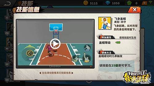 飞身盖帽:飞身起跳从对方球员的身后将球盖下,盖帽等级+30,盖帽成功时几率触发。