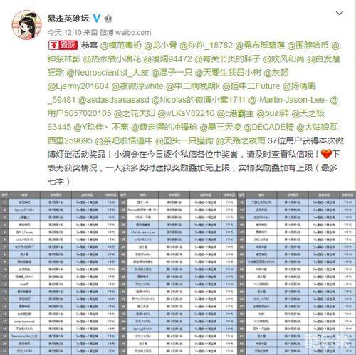 昨日中午,《暴走英雄坛》官方微博公布了元宵节灯谜活动的获奖结果;由于部分人多次获奖,21条灯谜共产生37位中奖者。官方表示将给予中奖者7天的信息完善时间,并会逐步分别颁发虚拟奖励与实物奖励。一些在活动中表现积极的玩家们将会得到大量的游戏内经验奖励与数个价值不菲的黄金箱,真是羡煞旁人啊!