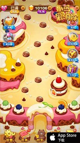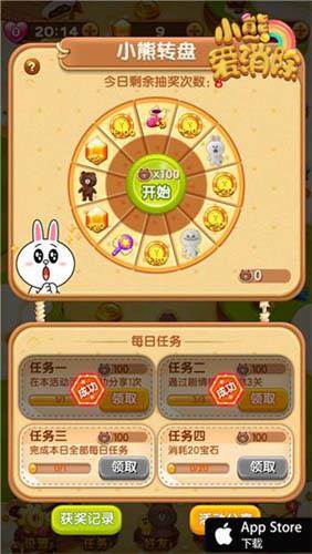 既然是LINE正版授权的手游,《小熊爱消除》与布朗熊、可妮兔的关系自然不仅仅是角色形象那么简单,游戏还将LINE正版授权的周边也融入到了游戏之中,是首款内置实物奖励的手机游戏。玩家在游戏中不断消除过关,挑战一个又一个难题的同时,也能相应的完成很多成就,并获得相应的奖励。此外,当玩家们返回游戏大界面的时候,还能在左侧发现“小熊转盘”功能,这里有超多实物奖励等待玩家们开启,酷帅布朗熊玩偶、可妮美照、可爱的馒头人以及炒鸡可爱至极的布朗熊马口铁盒,超棒奖励玩游戏完成任务就有机会获得,如此福利怎能不心动!