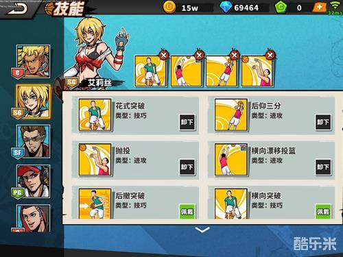 艾莉丝在技能携带上主要还是以进攻型技能为主,突破技能携带一个即可,推荐携带后撤突破或者花式突破,后仰三分是艾莉丝非常重要的技能,当自己的等级提高和三分球属性提高后,艾莉丝搭配后仰三分技能是十分恐怖的得分点。另外可以携带抛射提高自己上篮的距离,提高自己的2分球得分能力。最后一个技能携带飘逸投篮可以躲避对手的盯防。
