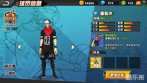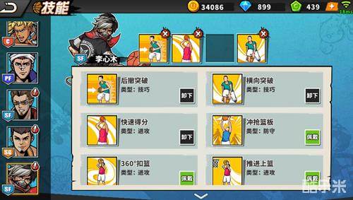 李心木的进攻主要在外线,技能搭配上后撤突破和横向突破也是他的必选技能,另外由于李心木不适合到篮下进攻,所以技能选择上推进上篮、拉杆上篮都这些突破到内线得分的技能都可以不携带,转而携带后仰中投和快速得分两个技能,或者选择携带其中一个中投姿势,外加一个冲抢篮板来加强自己队伍的低位篮板。