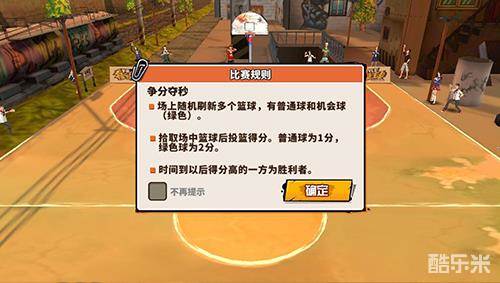 玩家进入关卡后可以看到争分夺秒的规则介绍,在球场上会随机刷新多个篮球,篮球分为普通球和机会球两种,机会球的颜色为绿色。拾取到球后玩家就可以在进行投篮,普通球的进球得分为1分,绿色球为2分。投篮时玩家可以选择自己角色擅长的得分区域,时间结束后得分多的一方获胜。