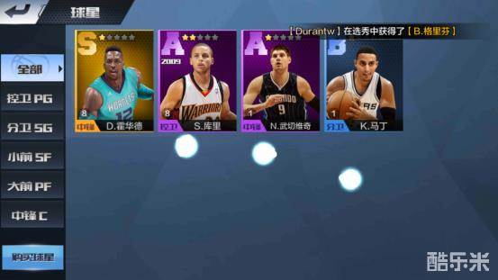 点击屏幕左侧的《控卫PG》、《分卫SG》、《小前SF》、《大前PF》、《中锋C》等选项,可以查看自己所拥有的球星列表信息,点击想要查看的球星,进行详细信息查看。
